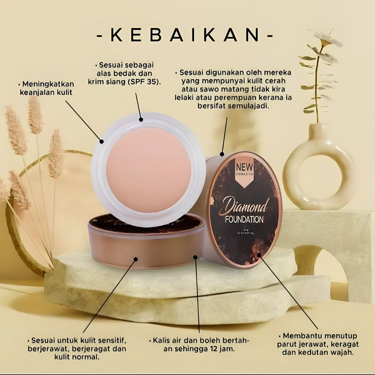 Dengan adunan kolagen dan formulasi terbaru, Diamond Foundation sangat membantu untuk: